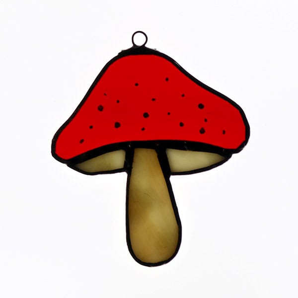 Somerset artist Frances Campbell skilfully combines her mosaic techniques with stained glass to create these beautiful transparent and light-catching pieces by hand. This charming spotty red toadstool has a little hanging loop incorporated into the top edge.