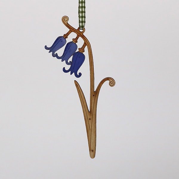 A really pretty hanging decoration, featuring a laser cut premium grade 3mm Birchwood bluebell motif. With handpainted details on one side, and finished with a green gingham ribbon. Could be left or right facing. Part of a collection of original laser cut pieces, designed and made in Somerset by Natty Deco.