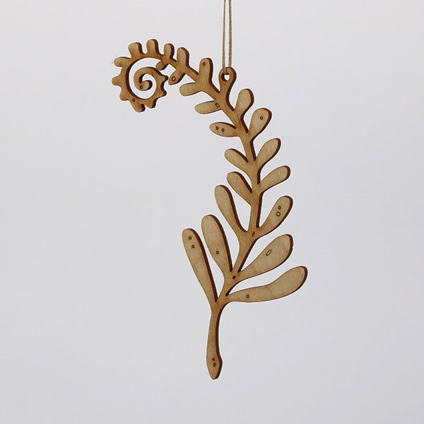 A lovely hanging decoration, featuring a laser cut premium grade 3mm Birchwood fern motif, finished with natural string. Could be left or right facing. Part of a collection of original laser cut pieces, designed and made in Somerset by Natty Deco.