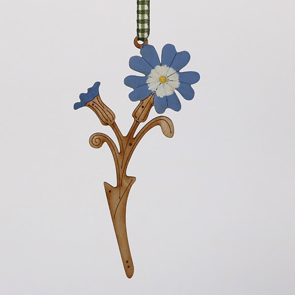 A really pretty little hanging decoration, featuring a laser cut premium grade 3mm Birchwood blue primrose motif. With handpainted details on one side, and finished with a green gingham ribbon. Could be left or right facing. Part of a collection of original laser cut pieces, designed and made in Somerset by Natty Deco.