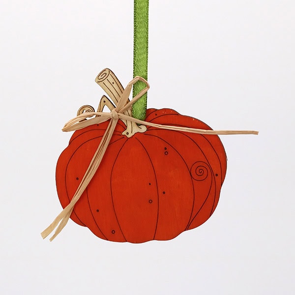 A lovely hanging decoration, featuring a laser cut premium grade 3mm Birchwood pumpkin motif, handpainted and finished with a pretty green ribbon and a straw bow. Could be left or right facing. Part of a collection of original laser cut pieces, designed and made in Somerset by Natty Deco.
