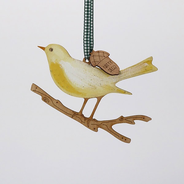 A charming hanging decoration, featuring a laser cut premium grade 3mm Birchwood songbird motif, on a branch with handpainted details in yellows. Could be left or right facing, finished with a pretty green gingham ribbon and a little branded acorn. Part of a collection of original laser cut pieces, designed and made in Somerset by Natty Deco.